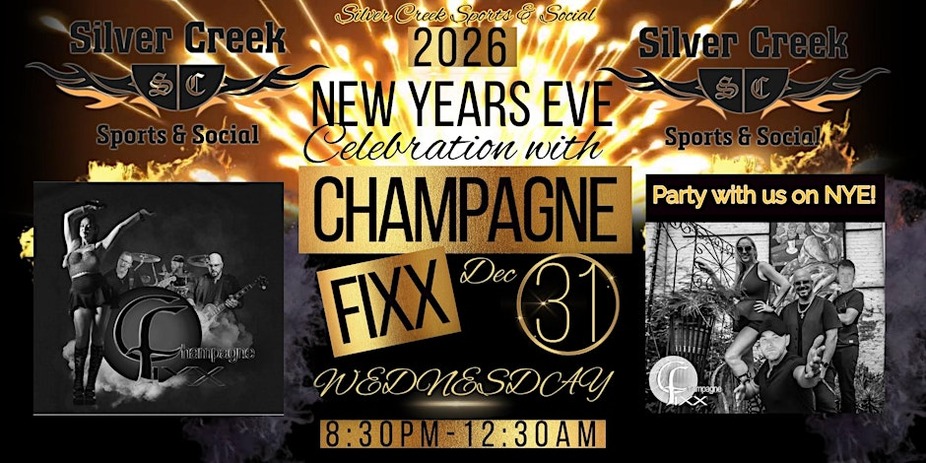 New Year’s Eve. Live music. Champagne flowing! Buy your tickets before they sell out here: https://www.eventbrite.com/e/champagne-fixx-new-years-eve-bash-silver-creek-sports-social-tickets-1976991777626?aff=oddtdtcreator